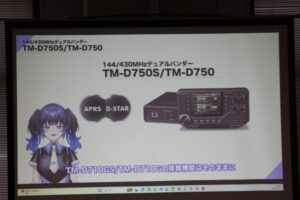 APRSやD-STARに対応したハンディー機のTH-D75と今年12月を目処に販売が開始されるモービル機のTM-D750について、東京のハムフェア2025で公開したビデオを再編集して、ビデオ上映でのプレゼンテーションが行われました。